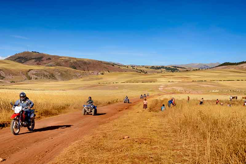The ATV tour begins at 7:00 am with the pick-up from your hotel (except if it is located outside the city center). We then head towards Cruzpata in our private transportation. Cruzpata is a small community located on the route to the Sacred Valley, about 40 minutes from Cusco. Here, there will be a pre-tour training session with explanations and some tips from the guide. We will start our adventure at the Maras Salt Mines and enjoy the beautiful scenery of the mountains in the Sacred Valley of the Incas. Then, we will head to the archaeological and enigmatic site of Moray, where you will take a break and have time to explore the area. At both sites, there will be enough time to receive information and take photos. Finally, we will return through the cultivated areas of Maras to our camp in Cruzpata, where the driver will be waiting to take you back to the city of Cusco. The driving tour lasts approximately 1.5 to 2 hours and covers a distance of approximately 50 km. There will be stops at viewpoints and special places for photo opportunities, where you can capture the everyday life of the people living there and where nature showcases its utmost splendor to impress us at every moment.