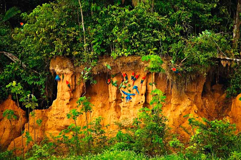 We wake up very early at 4:30 am to embark on an incredible boat journey to the largest macaw clay lick in the world, “EL CHUNCHO.” The boat ride will take approximately 1.5 hours, and along the way, we may have the opportunity to see species such as capybaras, which are the largest rodents, and tapirs. We might even spot the most beautiful feline of South America, the jaguar. Many of our clients have been witnesses, with photographic evidence, of encounters with these magnificent mammals. Upon reaching the macaw clay licks, you will see hundreds of parrots of different species gathering to eat the clay adjacent to the riverbank. We will settle in our chairs to witness one of the most stunning natural bird displays in the world. The parrots are followed by three species of the most colorful macaws in America, with red and green, blue and yellow plumage. They come together to consume the necessary clay in their daily diet and to eliminate toxins. On a good day of activity, you will see hundreds of these marvelous birds flying above you. It is an experience of a lifetime. We will then return to our lodge for breakfast and rest. Next, we will take a walk in the botanical garden where you can see various species of fruits, wood, and medicinal plants in our area, accompanied by our guide. Lunch will be served. In the afternoon, we will have the opportunity to go kayaking on the Tambopata River. We will silently navigate along the river, increasing our chances of observing the larger animals of the Tambopata Reserve. The evening is free for rest or the possibility of another night walk.